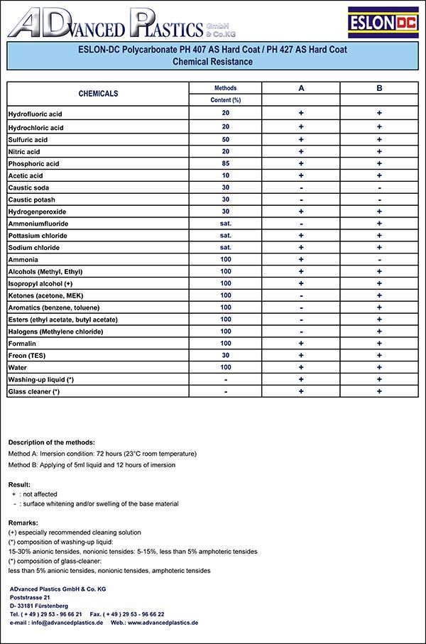 Polycarbonat zeigt sich als chemisch beständig gegenüber schwach konzentrierten Säuren, Ethanolen und Ölen. Polycarbonat in orangefarbiger Ausführung schirmt UV-Licht ab.