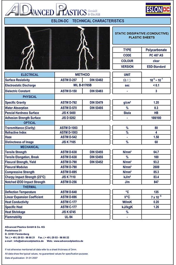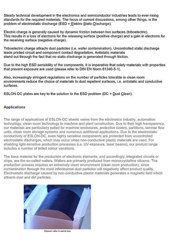 Antistatische, elektrostatisch ableitfähige Tafeln aus Polycarbonat. Der technische Fortschritt in der Elektronik- und Halbleiterfertigung führt zu immer höheren Anforderungen an die eingesetzten Materialien. Gleichfalls limitieren zunehmende Anforderungen an die Partikelanzahl in Reinraumbereichen die zur Auswahl stehenden Einsatzstoffe ebenfalls auf staubabweisende, d. h. antistatische und leitfähige Oberflächen. Zur Lösung dieser Problematik empfiehlt sich der Einsatz von Tafeln aus PC AS.